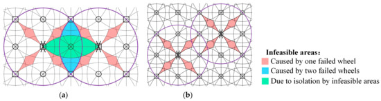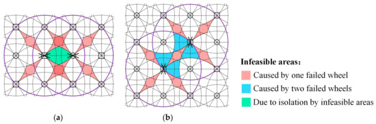 Infeasible areas with two wheels failed (with one normal wheel in between): (a) horizontal or vertical failed wheels; (b) diagonal failed wheels.