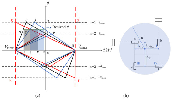 If the inscribed circle of a box only covers the four wheels that form a square, as shown in Figure 19b, the feasible areas for the horizontal and vertical wheels form a parallelogram, respectively. The upper parts form a triangle. For example, if the desired horizontal and rotational velocities of the box are within the triangle ABC, it is achievable with the constrained wheel velocity. The triangle ABD indicates the feasible desired vertical and rotational velocities of a box. If we draw a horizontal line indicating the desired rotational velocity of a box: , then the corresponding feasible horizontal and vertical velocities are within the ranges and , respectively.