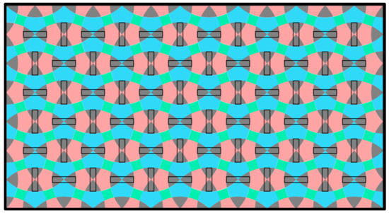 If we draw a boundary circle on the conveyor with the circle center located at one of the wheel centers and its radius being the same as the radius of the inscribed circle of the box, then if the box (represented by the inscribed circle) is located within the boundary circle, the wheel where the boundary circle is located will be covered by the box. The wheel will not be covered by the box if the box moves outside the boundary circle. If two boundary circles corresponding to two wheels have an intersection, the related two wheels will both be covered by the inscribed circle of a box if the box is located within the intersection area. With these, we can draw all the boundary circles for every wheel, as shown in Figure 10, Figure 11, Figure 12, Figure 13, Figure 14, Figure 15, Figure 16, Figure 17 and Figure 18. These boundary circles divide the conveyor into many small areas. Within different small areas, the number of covered wheels and their pattern may vary.