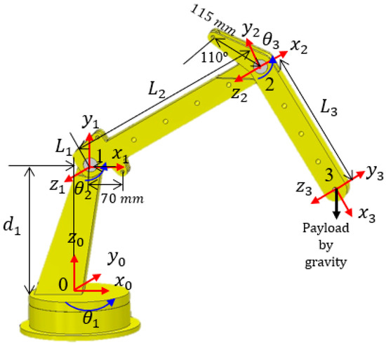 For Equations (1)–(5), the torque can be calculated corresponding to a given in a static or quasi-static state, but for a robot in a dynamic state, the value of the torque may vary depending on its velocity and acceleration. Therefore, the dynamics equation in Equation (6) should be considered. The weight of the link (1~2 kg) is relatively small compared to the size of the payload considered in this paper, which is 20 kg, so link masses are ignored in this pilot study.