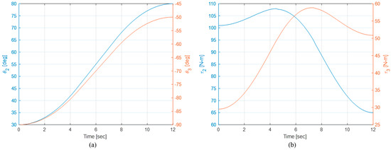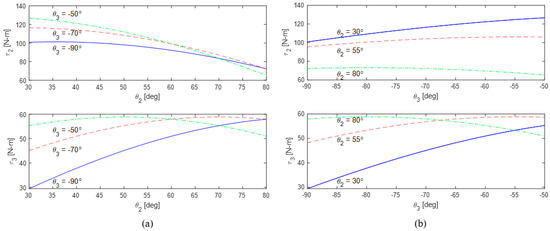 Based on Equation (8), the maximum torques for 2 and 3, where θ3 is fixed and θ2 is variable, the maximum required τ2 and τ3 are the following, respectively: