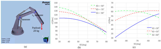 The required torque for the pitch joints in the earlier section was verified by using the commercial dynamics program, Ansys Motion 2023 R1 (Canonsburg, PA, USA), as shown in Figure 4. The material of the links was set to AL6061 and the payload of 20 kg was set. Figure 4b is the torque value by angle required for θ2, and Figure 4c is the torque value by angle required for θ3. When the torque results from Section 3 can be compared by the values from the computational analysis, it can be seen that the type of graph leads to a similar form, and the maximum torque values are shown and compared in Table 3. The required torques under various payloads were measured in the simulation, and the errors are 8.73% and 3.92% for the torque 2 and 3, respectively. These errors were mainly caused by the weight of the link itself (~1 kg per link) in the earlier calculations and the assumption that the turning radius is constant in the theoretical equations.