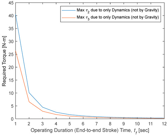 Since the calculation results were simulated from the previous study [20] in the prototype phase, the operating duration for traveling from the end to the top of the power cylinder could be slightly longer, the torques could be assessed slightly less than actual values. If the time duration becomes shorter, the dynamic terms can be dominant. As the motion time decreases, the velocity and acceleration also increase, so does the magnitude of the torque required by the dynamics terms. Therefore, the time duration of one stroke was varied, and required torques for dynamics terms except the gravity were assessed. Based on the same form of path planning, the magnitude of the maximum torque required by the dynamics terms, excluding the gravity term (g = 0 m/s2), is shown in Figure 7.