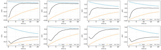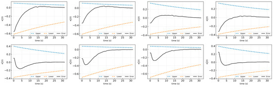 - where represents the convergence rate of the tracking error and denotes the steady-state performance metric, which can be set sufficiently small to meet performance requirements. The constants represent constraints on the system’s overshoot and are within the range of from 0 to 1.