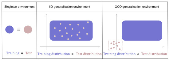 Zero-shot generalization data distribution. The singleton environment means that the training set is identical to the test set.The independent and identical (IID) generalization environment means that the two sets follow the same distribution while the out-of-distribution (OOD) generalization environment means that they follow different distributions.