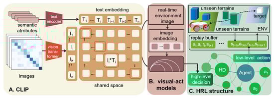 The system architecture of the proposed method is shown in Figure 2. It is a two-stage learning process with a combination of zero-shot learning and hierarchical reinforcement learning. Part A and Part B belong to the zero-shot learning methods. Part C is the main structure of hierarchical reinforcement learning. The designed visual-act model utilizes a zero-shot learning image encoder to transfer images into embedding. Then, image embeddings and correspondent labels are sent to a multi-head self-attention network. This work is shown in Figure 3. The outputs of this stage are action instructions according to input images. It identifies the focusing parts of image embedding related to the exact actions in each direction. The latter stage is a hierarchical reinforcement learning process. It utilizes a high-level and a low-level policy to form paths. The high-level policy determines the plausible area while the low-level policy provides exact action. In the meantime, images captured by a visual sensor are sent to the pre-trained model. Then, the pre-trained model provides action instructions to correct decisions made by the reinforcement learning part.