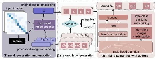 For each input image I, a series of object masks [26] are applied to block different regions. Specifically, some masks are applied to block certain vacant areas of the image, like grassland or remote objects, which is irrelevant to current action instructions. Some masks conform to the shapes of certain objects in the image, which are used to occlude specific objects in the image. The final number of masks is capped at sixteen by disregarding far-away and trivial objects. The original image and mask-processed images are represented as E and . By putting masks on images, the zero-shot image encoder can enlarge the features of the mask-applied part, and it can be reflected in the output embeddings in a way that allows attention mechanism and contrast learning.