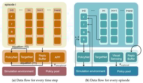 Visual servoing: For areas already explored, we employ the visual-act model to map input images to action directives. The network processes the visual input and outputs an action for the agent. During every step, these action instructions are added to a policy pool, which serves as the optimal policy to determine the parameters of the target net.