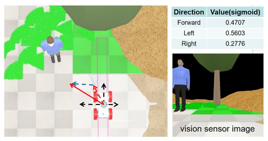 In Table 3, data labeled in bold have the highest similarity to the corresponding object after processing with the attention mechanism in all directions. For example, as shown in Figure 7, the tree is in front of the robot, and the similarity comparison represents that the corresponding processed embeddings raise focus on this obstacle from 0.2607 to 0.4121 while decreasing focus in irrelevant directions. This shows that the pre-trained model focuses on certain obstacles related to the corresponding action while disregarding the unrelated ones.