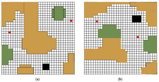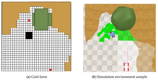 Environment representation; the simulation environments can be represented by grid forms. The red star represents the target, the green circle represents the starting point, the yellow blocks represent sand piles, the green blocks represent trees, and the black blocks represent people.