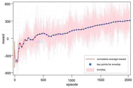 The management of the experience replay buffer [28] is adaptively adjusted based on the cumulative average reward, which serves as an indicator of the learning progress and the efficiency of the current policy. The cumulative average reward, , is computed as follows: