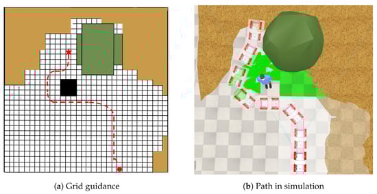 The singleton environment simplifies the problem space by using the same scenarios in both the training and test phases, allowing us to focus on the learning and optimization capabilities of the algorithms without the variability introduced by unseen test conditions. The experimental area measures 25 m × 25 m, and high-level grids are planned based on camera parameters to provide better guidance for macro-action. The representation of one train environment sample is shown in Figure 8.