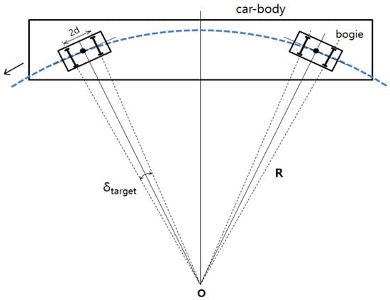 In order for a railway vehicle to drive ideally when passing through a curved section, the wheelset should be aligned in a radial position in line with the center of the curve radius, as shown in Figure 1, which ensures that the attack angle between the wheels and the rail is ‘0’, allowing the curve to be passed smoothly. In the radial steering position, steering control for ideal curve running, the target steering angle (δtarget) formed between the two axes of the bogie, which is the driving device of the railway vehicle, is given by the expression δtarget = 2d/R, based on the geometric relationship in Figure 1, where 2d is the wheel base and R is the radius of the curve [9].