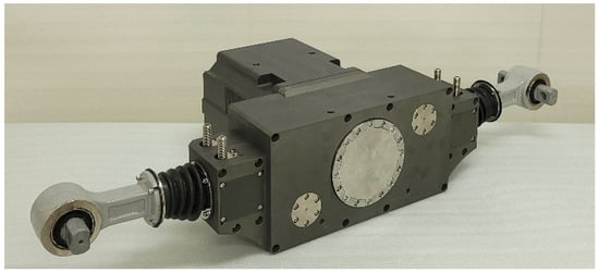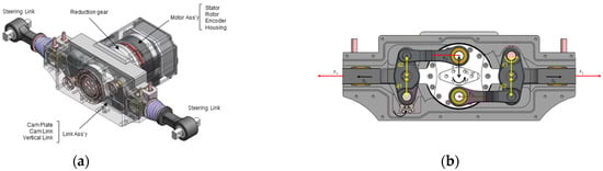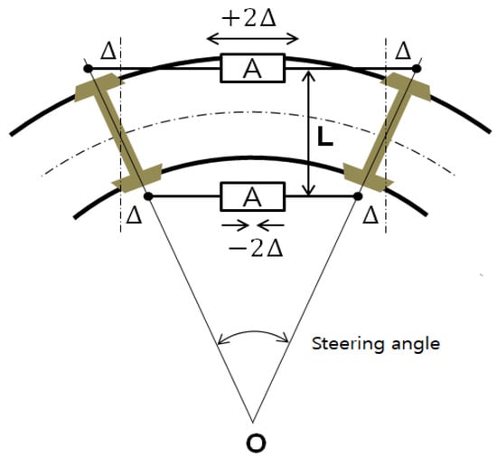 A steering action needs to be taken to achieve the steering angle by spreading the outer wheels of the curve and pulling the inner wheels using a steering actuator, as illustrated in Figure 2. Here, if the stroke of the steering actuator is Δ, the steering angle δact formed by the steering device is expressed as δact = 4Δ/L, based on the geometric relationship, where L is the distance between the outer and inner steering actuators. Therefore, for the development of electro-mechanical actuators to be applied to steering systems, performance objectives such as the actuator’s force, stroke, and reaction speed have been derived.