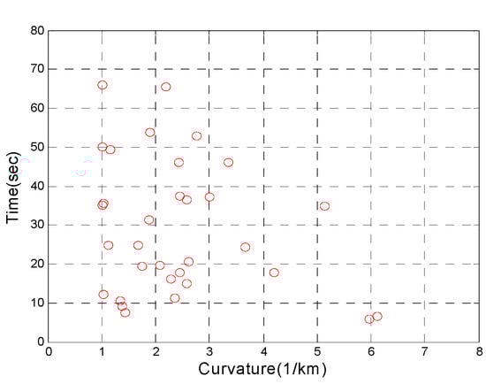 A multi-body dynamic simulation was carried out to estimate the maximum actuation force required by the actuator to control the steering when passing through a curve. The simulation showed that the maximum steering force generated by the steering actuator was 46.5 kN [10]. Additionally, to derive specifications for the actuator’s response time, the passing time for an urban railway vehicle to pass through a curved section when running on a commercial line was measured. As a result, the minimum transit time was 5.9 s, as shown in Figure 3. At this time, if the curve is assumed to be half the wavelength of the sine wave, the wavelength is 11.8 s, which is equivalent to 0.17 Hz when converted to frequency.