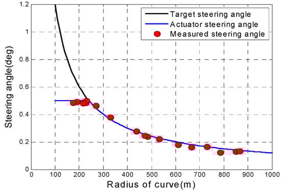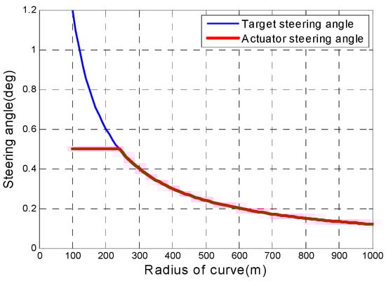 Figure 4 shows the steering angle performance that the steering device to be developed can implement when applying the steering actuator specifications as shown in Table 1, and controlling the radial steering position steering. The target steering angle δtarget increases as the radius of the curve (R) decreases according to the steering angle calculation formula δtarget = 2d/R [9]. For the steering system to be developed, the stroke of the steering link is limited to 5.5 mm due to the limitation of the spring displacement of the primary suspension system connected to the steering link. Therefore, the steering angle that the steering actuator can attain from the geometric relationship in Figure 2 is limited to 0.5 degrees, which corresponds to the target steering angle for passing a curve with a radius of 240 m. Therefore, on a sharp curve smaller than a curved radius 240, the steering angle that the designed steering device may implement is limited to 0.5 deg.