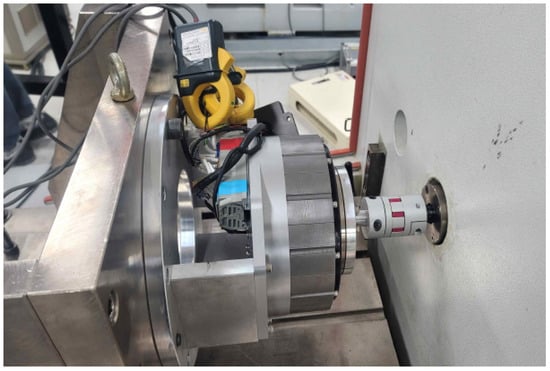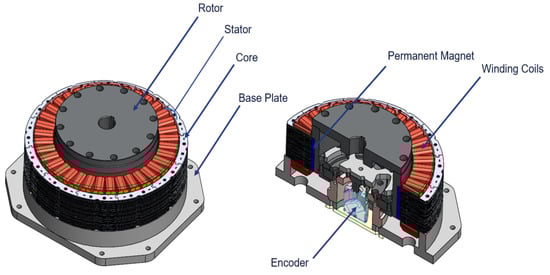 Figure 6 shows the configuration of the motor. The stator is arranged with alternating U-V-W coils with a phase angle of 120 °C, while the rotor has alternating permanent magnets with N and S poles. The absolute encoder, to detect the rotor’s rotation angle, was used to measure the motor’s rotation angle. The core of the stator is laminated with 0.5 mm thick electromagnetic steel sheets to reduce eddy current losses, and enameled copper windings of heat resistance class H (with a heat resistance temperature of 180 °C) are inserted into each core tooth. In addition, neodymium series (N45M) magnets with high magnetic flux density are applied to the permanent magnets of the rotor.