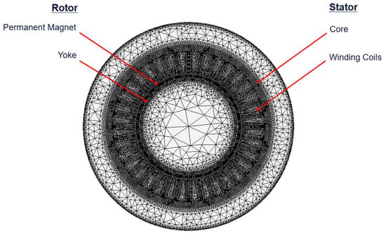 Electromagnetic analysis was conducted to evaluate the torque performance of the designed DD motor using a finite element model, as shown in Figure 7. The geometry of the model for electromagnetic analysis is illustrated in Figure 7, while the structure and physical properties of the model are presented in Table 3. Figure 7 shows the finite element model for electromagnetic analysis. The electromagnetic analysis was conducted to examine the changes in continuous torque due to the rotation of the rotor and the variations in torque resulting from an increase in applied current.