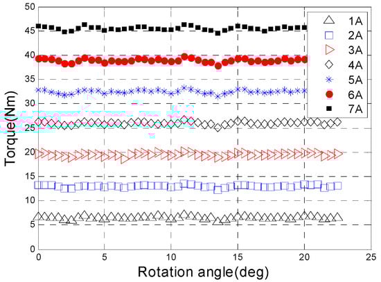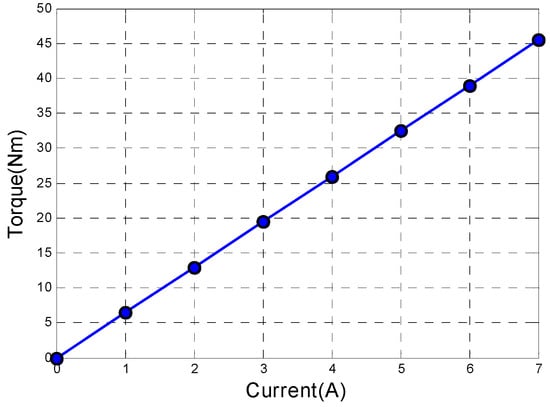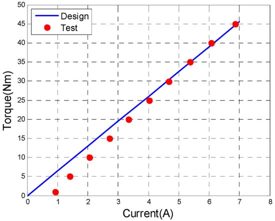 The speed of the motor was set to 360 rpm, which corresponds to the actuator’s response speed of 0.3 Hz, and the torque was measured as the current changed. Figure 12 shows the results of the torque test with the prototype motor. When the magnitude of current is small, the difference between the design value and the test result is large due to the electric and mechanical resistance of the motor, but as the magnitude of current increases, the deviation decreases, so the target current of 6 A shows the torque performance that meets the design value. That is, the torque design value at a current of 6 A was 39.53 Nm, but the test result was 39.97 Nm, and the error was 1.1%. Therefore, it was judged that the torque performance of the developed DD motor meets the design target specifications. Please see Table 5 for detailed performance parameters.