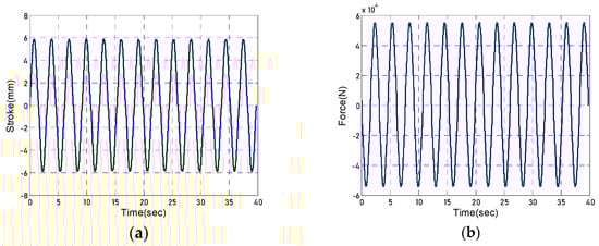Figure 15 shows the test results for the stroke, steering force, and actuation frequency for the actuator prototypes tested using the test bench. The maximum performance that could meet all the stroke, steering force, and driving frequency target specifications was tested. In Figure 15a is the measured stroke data, which shows a maximum of 5.9 mm, exceeding the stroke development target specification of 5.5 mm. Figure 15b is the force measurement result measured at the end of the steering link. The maximum value is 54,909 N, which meets the actuator steering force target specification of 50,000 N or more. Figure 15c is the operating frequency of the actuator, with a measurement frequency of 0.32 Hz, exceeding the target specification of 0.3 Hz. Therefore, the developed electric mechanical actuator meets all the development target specifications, so it is thought that it can be used as a steering device when running a curved section of a railway vehicle.