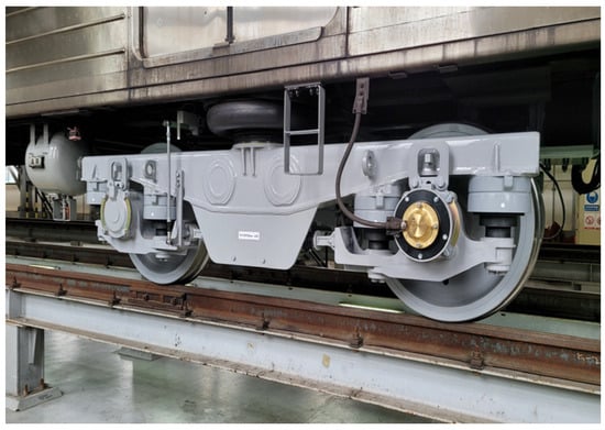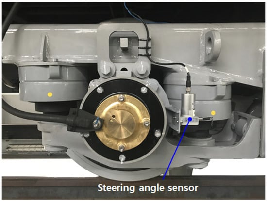 A field test was conducted by installing the developed electro-mechanical actuator prototype on a railway vehicle to verify its actual steering angle performance. A subway train operating on a commercial subway line with many curved sections was chosen as the test vehicle. To steer the wheelsets in the curved section, each steering actuator must be installed on the left and right sides of the bogie, which is the driving device of the railway vehicle, as shown in Figure 2. Therefore, as shown in Figure 16, two actuators were installed on both sides of the bogie. Figure 17 shows the shape of the bogie of the test train.