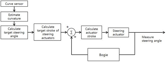 The control for steering the wheelsets in the curved section is performed according to the steering control algorithm as shown in Figure 18. First, the curve is detected with a curve detection sensor, and the target steering angle is calculated as shown in Figure 4 by a steering controller. After that, the controller calculates the motor rotation angle of the steering actuator corresponding to the target steering angle and sends the command to the actuator motor to drive the actuator. The rotation angle of the motor actually driven is measured by the encoder installed in the motor, and control is repeatedly performed to match the command motor rotation angle.