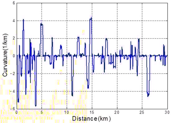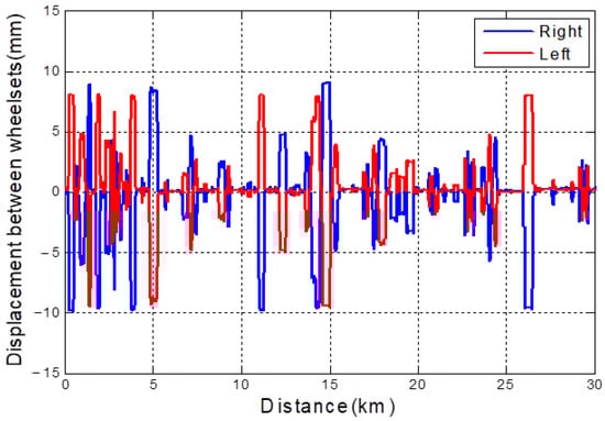 Figure 19 shows the curve distribution of the test line for the steering control test of the curved section. The total length of the test line is about 30 km, and various curves with different curved radii are distributed, and the curved radius of the minimum curve is 180 m. In the end, since it is important to measure the steering angle formed between the two wheelsets of the bogie by steering control while driving over the curved section, a cable type displacement sensor was installed as shown in Figure 20 to measure the distance between the two wheel sets.