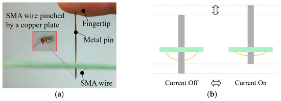 We employ Bio Metal Fiber 75 (Toki Corporation, Tokyo, Japan), with a length of 5 mm, to generate micro-vibrations. It is a filiform wire of NiTiCu-composite SMA that exhibits a one-way shape memory effect with a transition temperature of about 70 degrees Celsius. A filiform SMA wire shrinks up to 5% in the length direction when transformed to the Austenite phase from the Martensite phase (Figure 1). We fabricated the actuators, as shown in Figure 2a, using an SMA wire and a metal pin. The diameter of the pin is 0.76 mm, and a tiny hole is made at one end of the pin, through which the wire is passed so that the wire and the pin make contact with each other. Both ends of the wire are pinched using a copper plate, which is soldered on the circuit board to apply electric current for generating Joule’s heat in the SMA body, resulting in an immediate temperature rise and wire shrinkage in the length direction. When the current stops, the heat in the body is immediately radiated, causing the wire to return to its original length in accordance with the temperature drop. By repeating the on–off of electric current, micro-vibration is generated in accordance with the wire deformation. The micro-vibration is effectively conducted to the metal pin to be mechanically amplified to large vibration, so that the user sufficiently perceives the vibratory stimuli by touching the other end of the pin, as shown in Figure 2b.