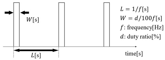The actuator is controlled by an electric current with pulse width modulation (PWM) using a Raspberry Pi microcomputer. Figure 3 shows an example of a pulse wave current. The pulses with W [s] width are given with L [s] time intervals. These values can be adjusted by controlling the frequency f [Hz] and the duty ratio d [%]. The width and the time interval are represented with the frequency and the duty ratio as and , respectively. The frequency means how many times pulses appear in a second, and we have confirmed that the actuator responds up to 300 Hz [38]. Vibrations with this frequency range are recognized as different tactile sensations by stimulating the RA I and/or RA II mechanoreceptors situated under the skin surface. The frequencies up to 50 Hz are recognized by the RA I receptors, and on the other hand, the frequencies greater than 30 Hz are perceived by the RA II receptors. The greater duty ratio supplies greater energy, which causes greater vibration as stronger vibratory stimuli. By controlling the frequencies and the duty ratios, the system is able to present various tactile stimuli to human tactile receptors.