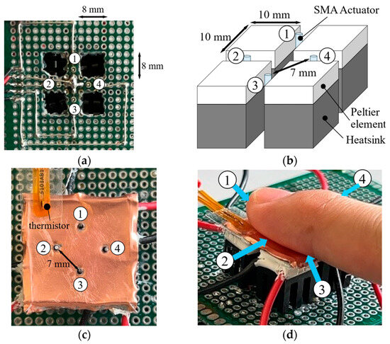 The tactile display is fabricated by combining the SMA actuators and the thermal stimulation unit on a circuit board, as shown in Figure 4, which is integrated with a touch interface panel for user operations. First, as shown in Figure 4a, four holes with a size of 8 mm × 8 mm are cut out in the circuit board for effective heat dissipation. Four SMA wires are soldered at the four positions shown from 1 to 4. The distance between each SMA actuator is set at 7 mm, as shown in Figure 4b, which is approximately 3 times greater than the spatial resolution of the human fingertip as 2–3 mm [40], allowing users to discriminate the physical vibratory stimuli presented by the pins. Four Peltier elements on heatsinks are also placed on the 4 holes. The surface of the constructed display is covered with a copper plate, allowing each SMA actuator to be stably situated at the designed location with its height properly adjusted, as shown in Figure 4c. The height was adjusted by cutting the pin to a specific length of 19.2 mm. A user places the index finger on the copper plate, as shown in Figure 4d, and perceives the stimulus of vibration and temperature. While the thermal stimulation unit is driven, a fan situated below the circuit board is operated to generate an airflow to release the heat from the heatsinks.