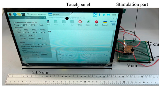 The SMA actuators and thermal stimulation unit are driven by a specially designed current controller to provide sufficient electric current, by amplifying the control signal generated by the Raspberry Pi microcomputer. The motor driver also controls the current to flow bi-directionally, allowing the thermal unit to work for both cooling and heating. These controlling circuits are implemented on the backside of the touch panel, making the whole system compact, as shown in Figure 5. An operator is able to simply generate the desired stimuli by setting the three control parameters presented on the interface panel, which are temperature, vibrating frequency, and duty ratio.