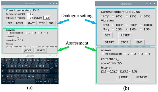 We designed two different dialog boxes to provide user interfaces for controlling the tactile display, as shown in Figure 6, which are (a) a dialog box for custom parameter settings with a virtual keyboard and (b) a dialog box with preliminary defined parameter values. An operator selects one of the dialogues based on the preference. By using the interface (a), an operator is able to customize the driving conditions of the actuators for examining detailed tactile sensations. On the other hand, by using the interface (b), an operator is able to check the necessary tactile sensitivity by using the preliminary-selected parameter values for driving the device. In both the interfaces, the temperature of the display is presented at the top of the display and updated every 0.5 s.