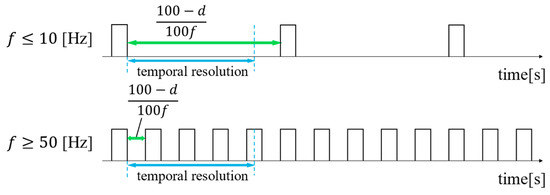 The qualitative results recognized by the subject were obtained as follows. At 5 and 10 Hz, he reported the sensations like being finely tapped. On the other hand, vibrations of other frequencies were perceived as small vibratory sensations with different tactile feelings. The temporal resolution of the human skin is reported to be approximately 30 to 80 ms [41]. By adopting the temporal resolution value of 30 ms, which presented the most sensitive sensation in the reference [41], the condition of the pulse current to provide vibratory sensation whose time interval is longer than the temporal resolution can be given by the following inequality.