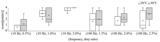 The experimental results are summarized in Figure 8. The scores decreased at 20 degrees Celsius compared to 30 degrees Celsius. The tendency of lower sensitivity at a lower temperature is remarkable at 100 Hz. This is consistent with the previous reports, which reveal that cold stimulus worsens the sensitivity at higher frequencies. For a better understanding of the thermo-tactile interactions, the temperature dependence at higher frequencies and the influences of warmer stimuli will be further investigated by including detailed parameter conditions in our next work.