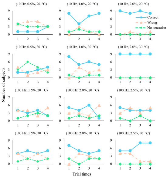 Figure 9 shows the change in recognition response by trial times at each condition. The blue markers represent the number of subjects who correctly recognized the vibration. The red markers show the number of subjects who answered a certain number but did not correctly identify the vibrating pin, while the green markers indicate the number of those who did not feel vibrations. The trial times did not have any particular effects on the response types. Therefore, it is estimated that adaptations, fatigue, and accustom by repeated trials did not occur in the use of our tactile device.