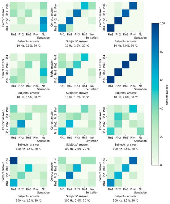 Figure 10 presents the confusion matrices between the correct answers and the subject’s answers in each condition. The vibrations at 10 Hz with a 0.5% duty ratio tended to be reported with no sensation. The vibrations at 100 Hz at 20 degrees Celsius were confused with other pins situated in adjacent locations, though the physical stimuli were recognized. The ratios of correctly identifying the vibrating pin tended to increase in accordance with the increase in the duty ratio at 10 Hz, while it was nearly stable at 100 Hz.