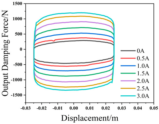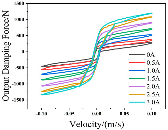 The output damping force–displacement curves under different currents are shown in Figure 2, and the output damping force–velocity curves are shown in Figure 3.