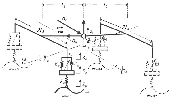 In order to better characterize the body attitude, this paper establishes a multi-degree-of-freedom vehicle dynamics model including the body droop, pitch, and roll motions as well as the unsprung mass droop motion, as shown in Figure 4.