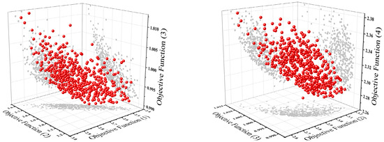 By selecting the fitness values of different objective functions as the x, y, and z axes, the objective Pareto front view can be obtained as shown in Figure 6. The solutions in the Pareto optimal solution set satisfy the non-dominated relationship with each other.