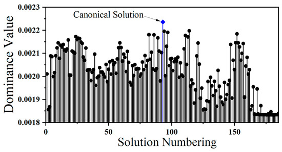 According to the above equation, the dominance values of all solutions in the external set are calculated, and the solution with the largest dominance value is selected as the typical solution of the Pareto optimal solution set, as shown in Figure 7.