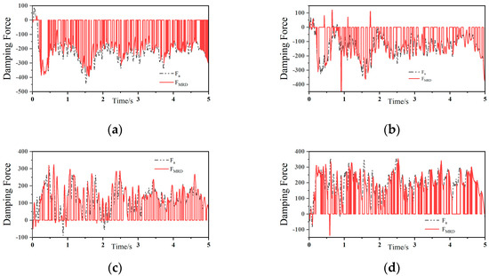 Damping force comparison: (a) damping force of the left front tire; (b) damping force of the left rear tire; (c) damping force of the right front tire; and (d) damping force of the right rear tire.