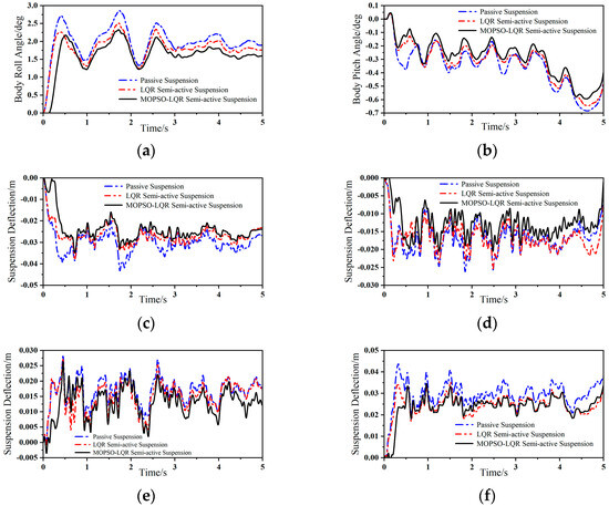 Time domain response curve of body attitude: (a) body roll angle; (b) body pitch angle; (c) left front suspension deflection; (d) left rear suspension deflection; (e) right front suspension deflection; and (f) right rear suspension deflection.