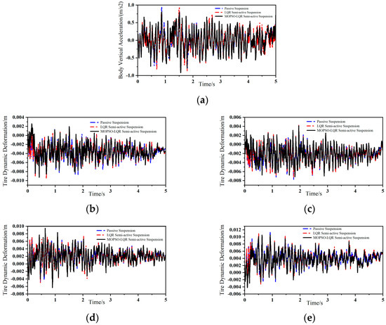 Time domain response curves of vertical acceleration and tire dynamic deformation: (a) body vertical acceleration; (b) dynamic deformation of the left front tire; (c) dynamic deformation of the left rear tire; (d) dynamic deformation of the right front tire; and (e) dynamic deformation of the right rear tire.