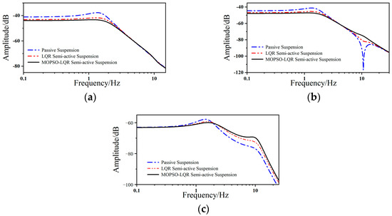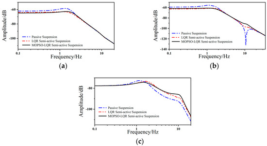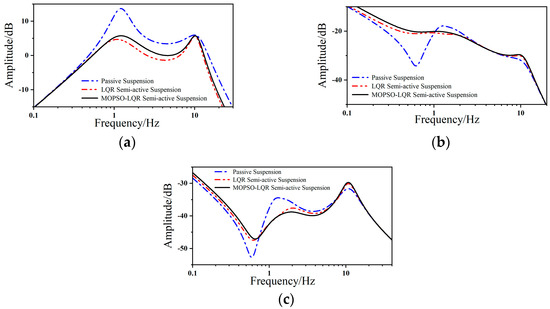 The operation under braking conditions is similar to that under steering conditions, and the response due to longitudinal inertial acceleration is mainly in the low-frequency band. As can be obtained from Figure 13, the body pitch angle, suspension deflection, and tire runout under the influence of longitudinal inertial acceleration, the response of MOPSO-LQR semi-active suspension is better than the response of passive suspension and LQR semi-active suspension at the low-frequency band. Figure 13b shows that, under braking conditions, the passive suspension also has a trapping effect on the suspension dynamic deflection response at 10 Hz, while the MOPSO-LQR semi-active suspension does not exhibit this phenomenon, and the improvement is higher than that of the LQR semi-active suspension.