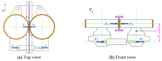The traction force is represented by , while denotes the frictional force acting on the drive friction wheel in the direction of travel. is the clamping force exerted on the contact point between the friction drive wheel and the track by the clamping oil cylinder, and refers to the clamping force applied on the motor housing by the clamping oil cylinder. The vertical restriction of the drive unit is supported on the track surface by steel guide wheels, offering high stiffness and minimal deformation. To simplify the analysis, the friction between the guide wheel and the track, as well as the vertical displacement and friction of the friction drive wheel, are neglected during horizontal motion. By determining the position of the vertical center of gravity from the front view, a set of force equilibrium equation, Equation (1), can be derived to establish the balanced state during horizontal movement.