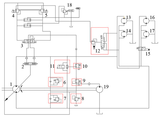 Schematic diagram of the monorail crane speed regulation circuit. 1—Variable pump; 2—variable cylinder; 3—hydraulic control main valve; 4, 5—proportional pressure reducing valve; 6, 7—high-pressure safety valve; 8—relief valve; 9—pressure reducing valve; 10—pressure reducing relief valve; 11—manual reversing valve; 12—flushing valve group; 13, 14—constant drive motor; 15—reversing valve; 16, 17—cut-off drive motor; 18—power valve group.