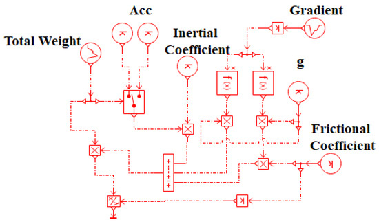 where represents the gravitational component of the entire vehicle’s weight in the direction of the slope, kN; indicates the self-weight of the drive unit, kN; represents the total weight of the lifting load, kN; signifies the slope of operation in degrees; denotes the inertia coefficient, generally taken as 1.075 for mining equipment; indicates the acceleration of the monorail crane during operation. Under normal conditions, when heavily loaded, , and when unloaded, , where represents the coefficient of friction between the drive wheel and steel rail, signifies the resistance coefficient, is the hydraulic motor transmission resistance, and indicates the number of drive units put into operation.