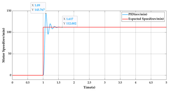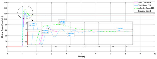 As an example, traditional PID and fuzzy adaptive PID control methods are employed to regulate the hydraulic speed control system model of the monorail crane. Considering the empty-load transportation condition of a monorail crane with a target motor speed of 112 rpm, the simulation results are illustrated in Figure 26. Specific parameter comparisons can be found in Table 4.