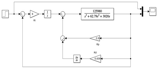 Here, variable acts as the process variable, input into the proportional and derivative stages, while error continues to be input into the integral component. Using the control law discussed above, the simulation model diagram developed in Simulink is shown in Figure 21.