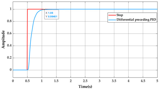 As shown in the graph, by incorporating the aforementioned controller, the system exhibits negligible overshoot in response to a step input with an amplitude of one and a settling time of 0.58 s, demonstrating excellent overshoot suppression.